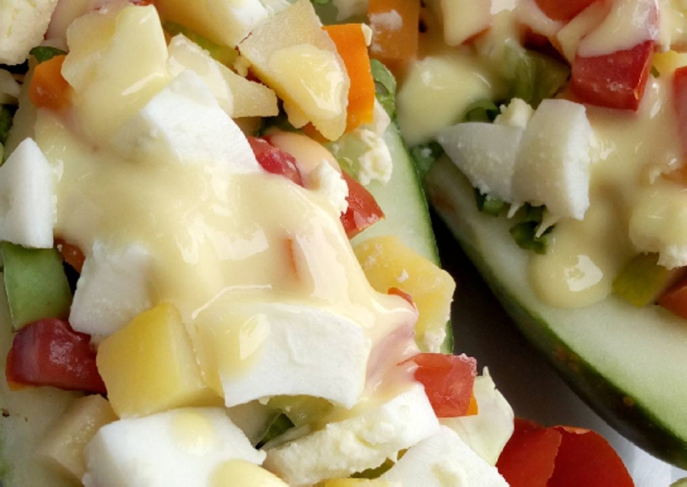 - Boil the potatoes, egg and carrots. Wash your vegetables and chopped them. Cut your cucumber into two, remove the inside and arrange all the vegetables nicely in it. Sprinkle your cream and enjoyđ