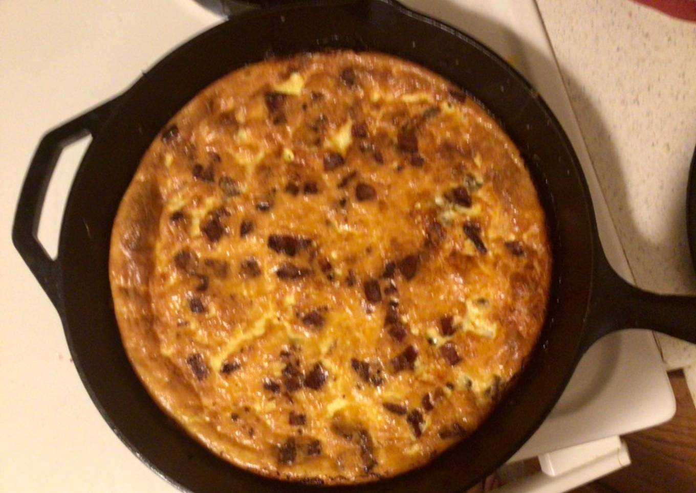 - Heat 12” cast iron pan to medium low. Add bacon grease, butter, and onion; sauté until translucent and slightly brown.