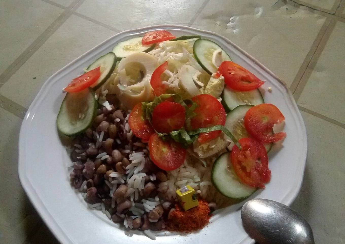 - Cook the rice,then beans saparately,then mixed it together to steam for some minutes,serve put oil,pepper,Maggi nd simple salad to enjoyđ