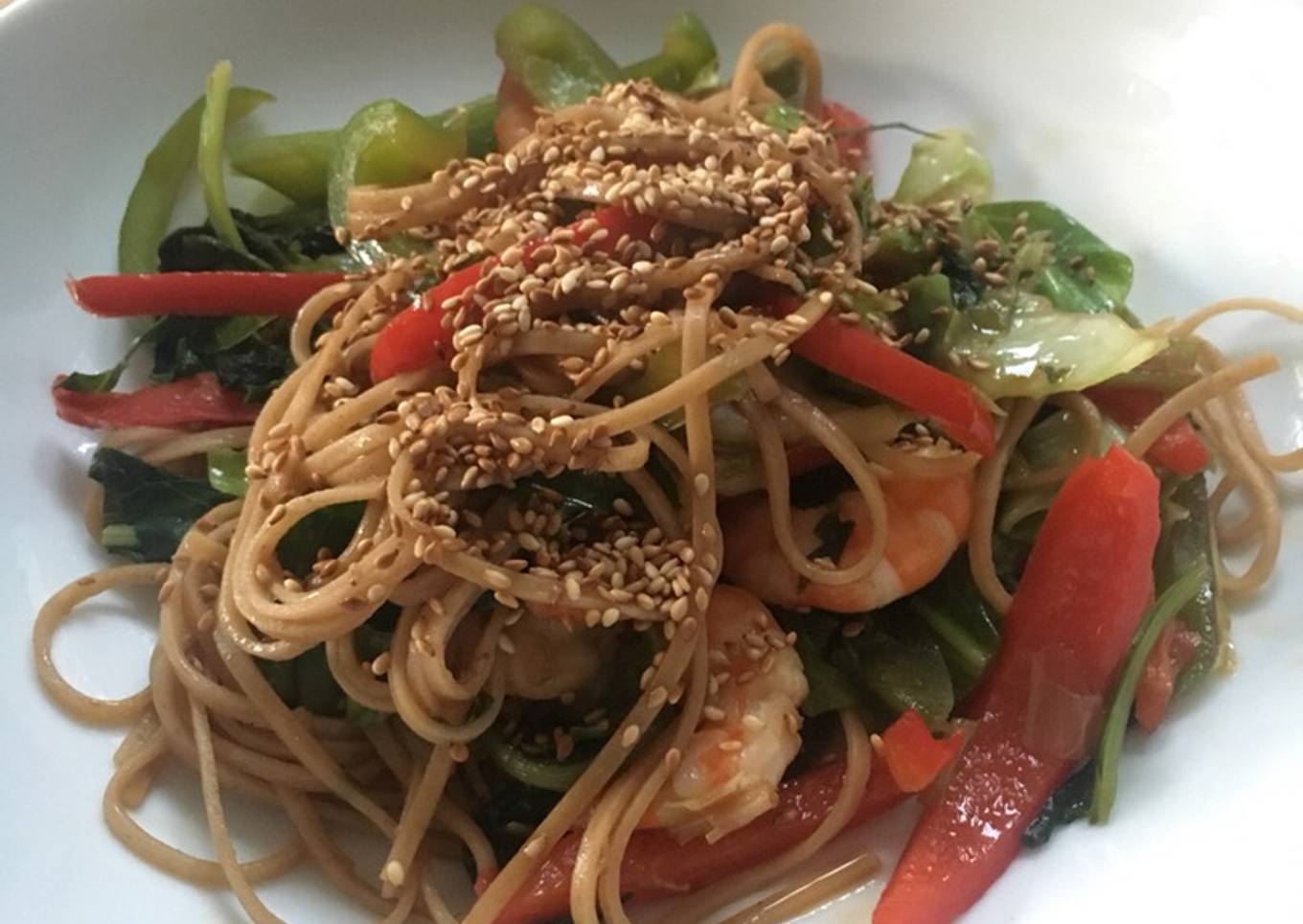 - Add the prawns, noodles and a few tablespoons of soy sauce to the veg, stir fry together until all mixed in