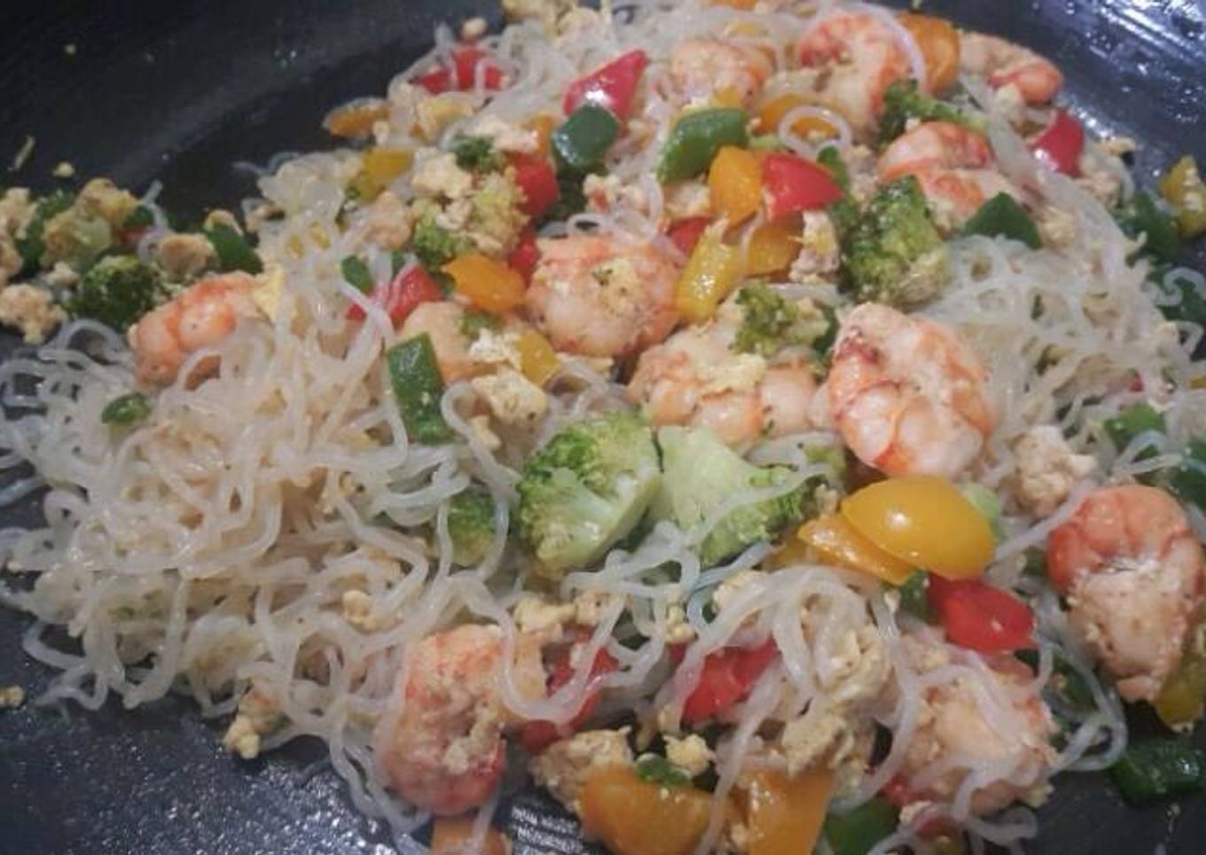 - Lightly oil your pan and put in garlic, shrimps, broccoli and bell peppers.