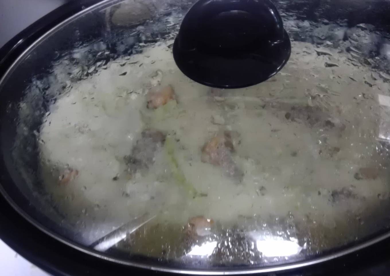 - I keep the skins on the potatoes and wash them in a vinegar solution for 10 minutes. About a Tbs of vinegar to the water will kill most organisms. Put everything in Crockpot except cabbage, milk, evaporated milk butter and Flour. Set to low for 8 - 10 hours, high is about 4 hours. Much later, Use the liquid in the Crockpot plus add a little more water to cover the cabbage in a pan and cook on high boiling until soft (about 10 minutes). You can also add the cabbage in the beginning. I boil it to get it soft. Then add to Crockpot. Roux: Heat 1 stick butter, 1 can evaporated Milk, 1/2 cup Milk, then add 1 cup flour and stir until thickened, then quickly add to Crockpot, turn to high, stir then let cook for another hour with lid on. Stir and serve with your favorite toppings: bacon, cooked ham, cheddar cheese, green onion, etc. I also had a loaf of bakery garlic bread that was in the fridge that needed to be eaten. Enjoy, I know my family did! yummy and creamy!
