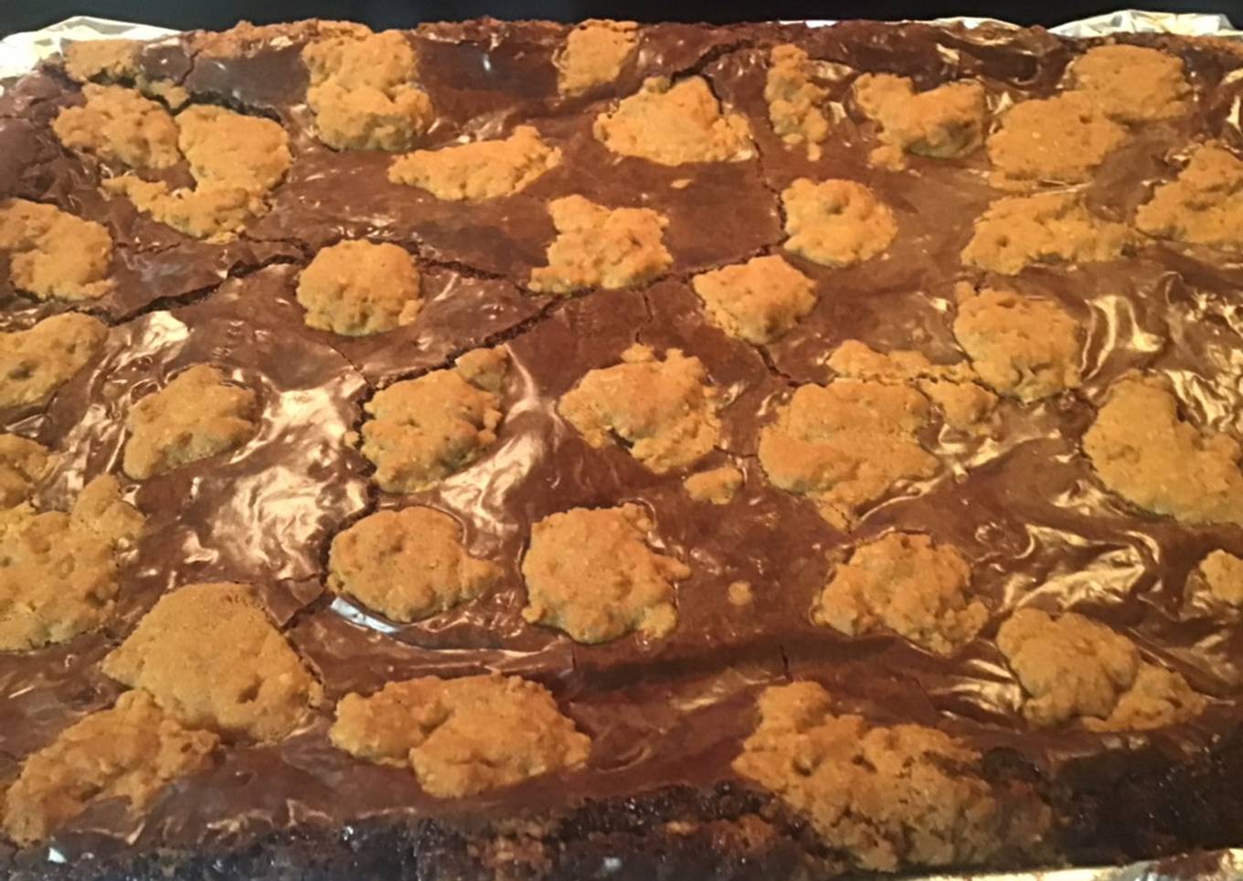 - Pat 2/3 of the oat mixture into bottom of baking pan. Spread chocolate mixture over oat mixture. Dot with remaining oat mixture. Bake 25 minutes or until top is light golden. (chocolate mixture will still look moist.) Cool on wire rack and cut into bars.