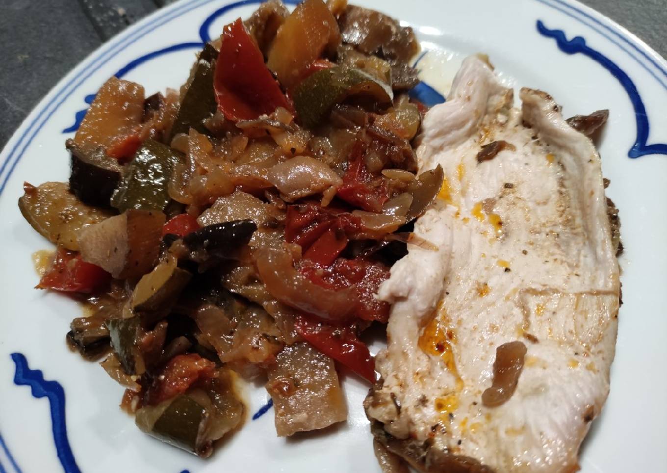 - A la fin de la cuisson, mélanger de nouveau. Déposer les escalopes sur le dessus, reposer le couvercle, et laisser encore cuire le temps de préparer la table.