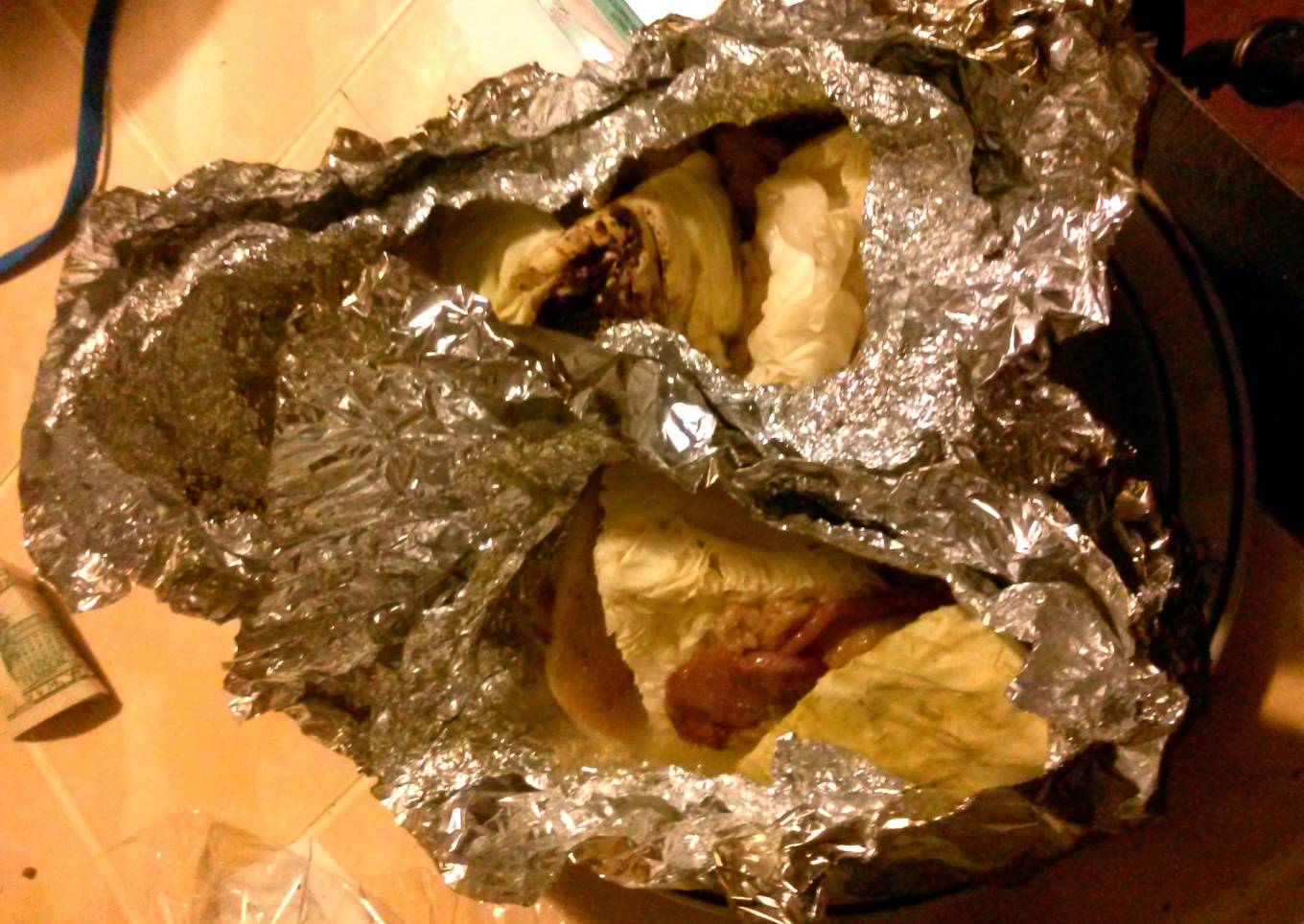 - take out your aluminum foil, cut off enough so it will cover up good, double foil it for leaks.