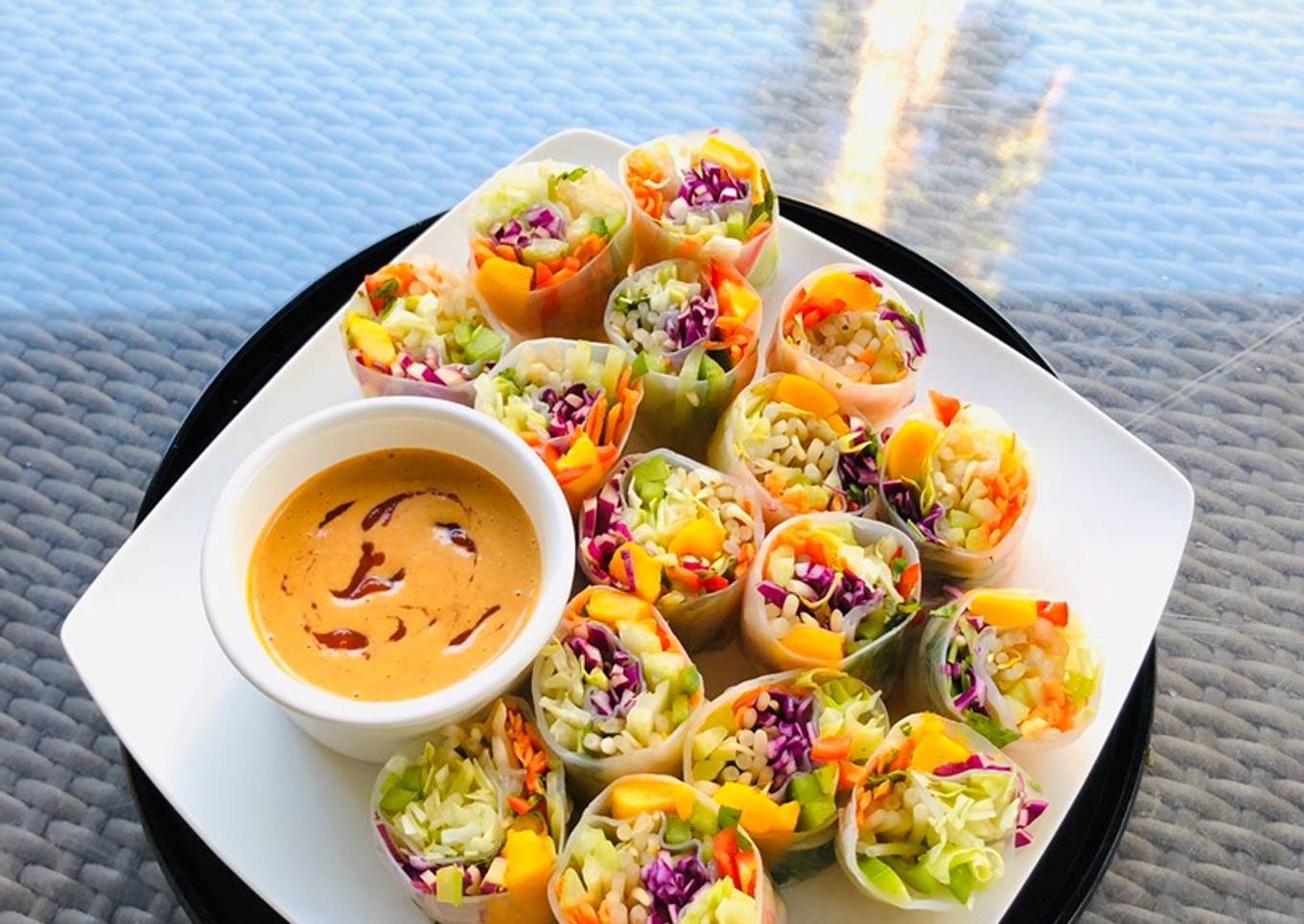 - Lastly plating your vegetables rolls beautifully, and serve with peanut sauce (I added the sriracha into peanut sauce just before serving, and mixed it together).