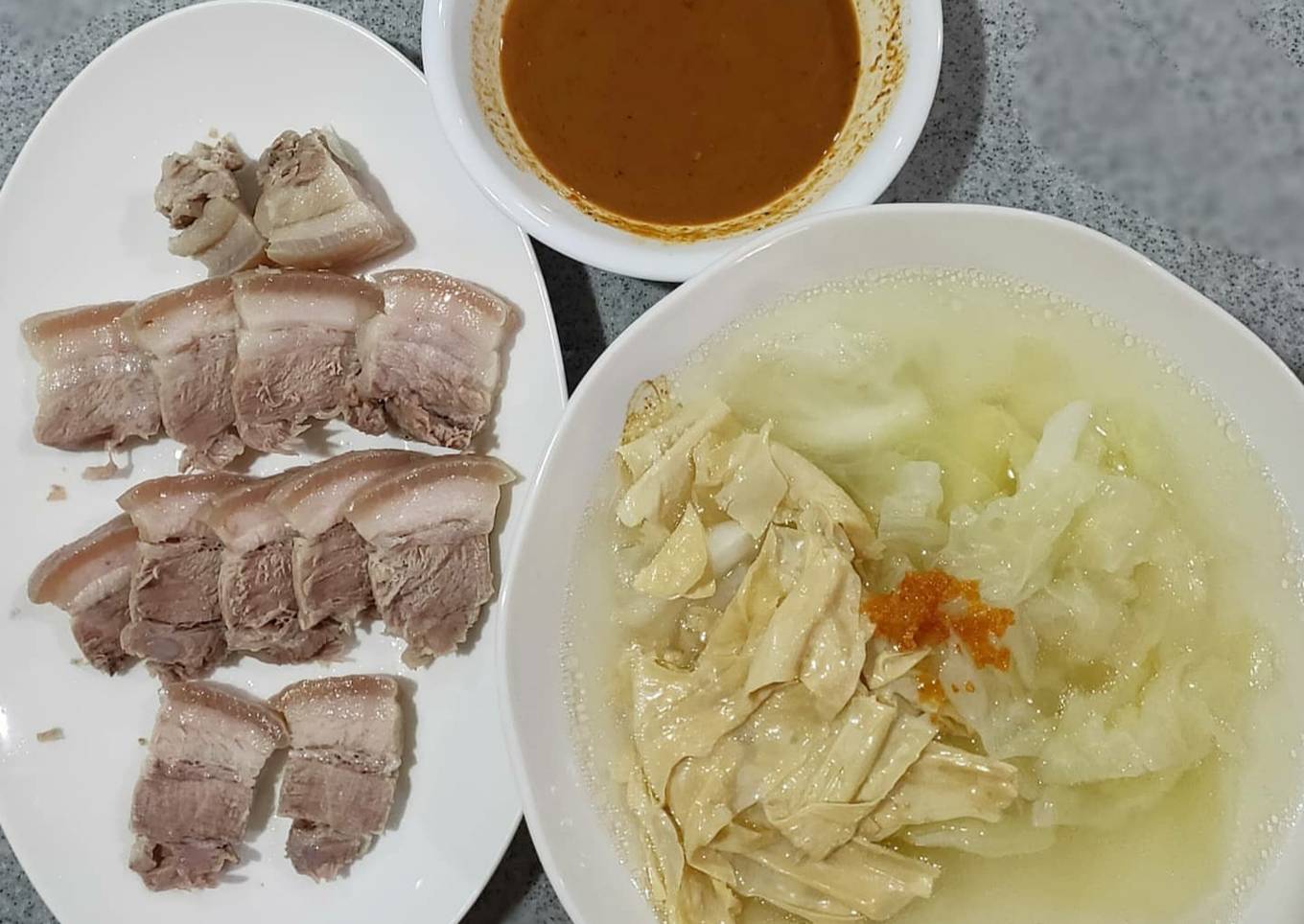 - Cut pork belly into slices before serving. Optional you can use any sauce you like if you can't cop shrimp paste.