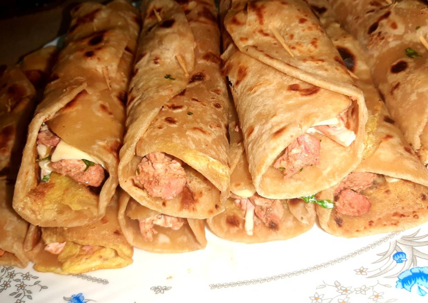 - Whisk 3 eggs with little salt,make flat bread/chapati like tortilla. Now pour 2 to 3 tbsn of egg on chapati and pour little oil and turn and press till so that egg sticks now turn.see pic 3