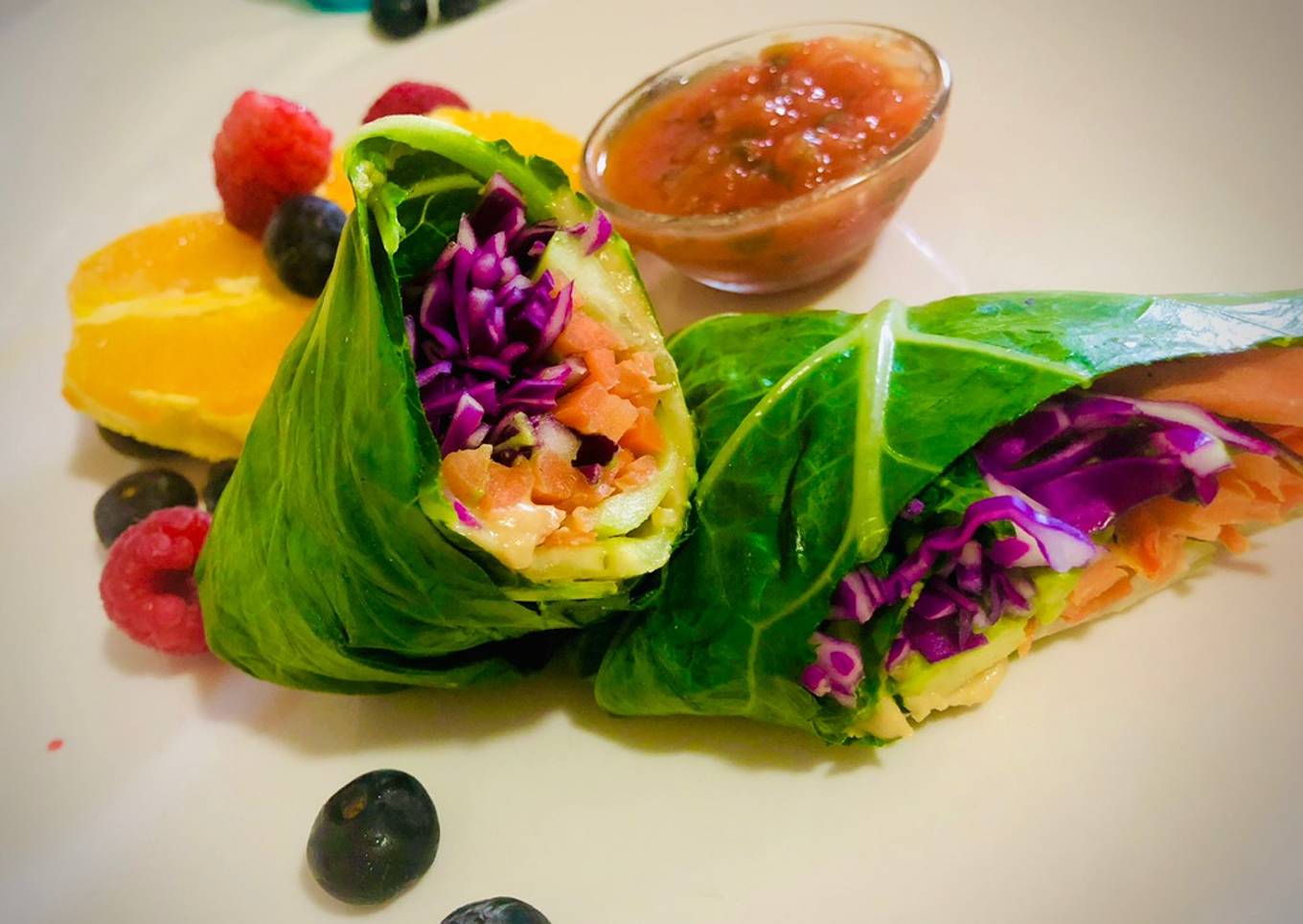 Collard wraps with veggies , hummus and beans is very delicious and healthy .. and it’s easy and quick to make just lightly warm the leaves make them pilable to roll it ..