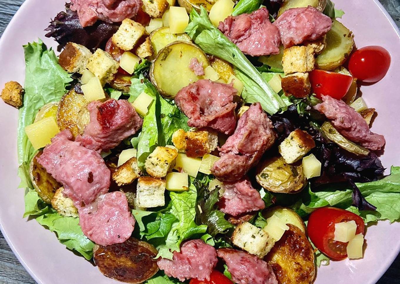 - Une fois lavée disposer la salade dans votre assiette puis commencer à dresser : en mettant les tomates cerise, les pommes de terre, le fromage, les croûtons et les gésiers
