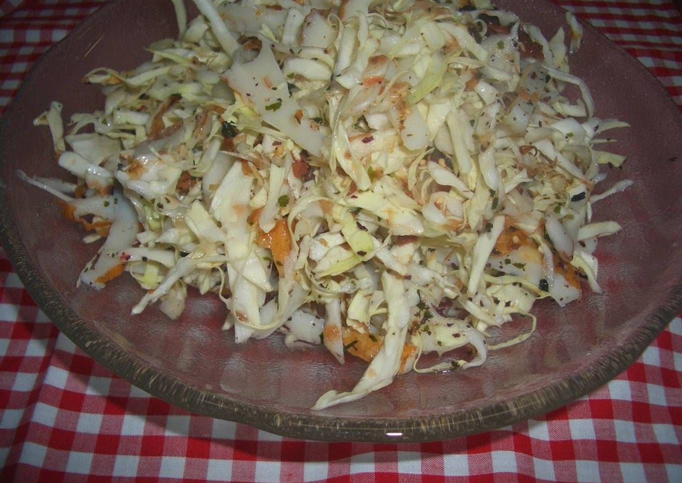 My neighbor gave me a load of cabbage and I wanted to make it into a refreshing salad, so I came up with this recipe. Be sure to soak the chopped cabbage in water to crisp it up. Recipe by Akoyu