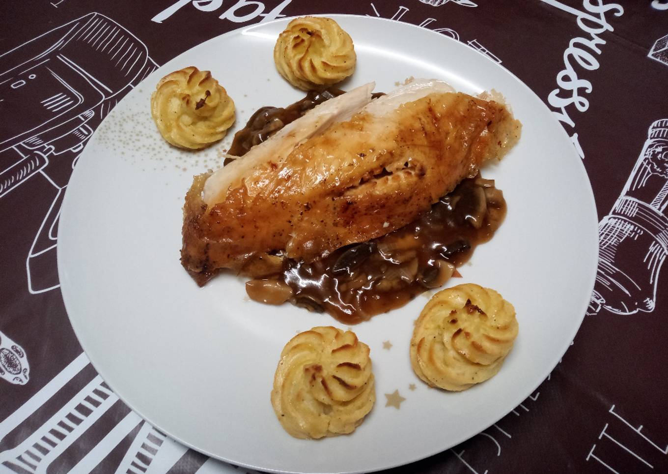Steps to Make Super Quick Homemade Chapon rôti, sauce champignon et pommes duchesse
