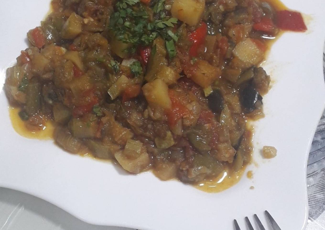 - Faire chauffer l'huile dans une sauteuse, mais l'oignon l'ail et une pincée de sel et une cuillère à soupe concentré de tomate ajoutez les aubergines, courgettes, carottes, pomme de terre, assaisonné de nouveau et laisser cuire à feu moyen pendant 5 min Ajoutez ensuite le tym laurier romain sel poivre puis les tomates et le verre d'eau Laisser mijoter à couvert et à feu doux pendant 30min bon appétit