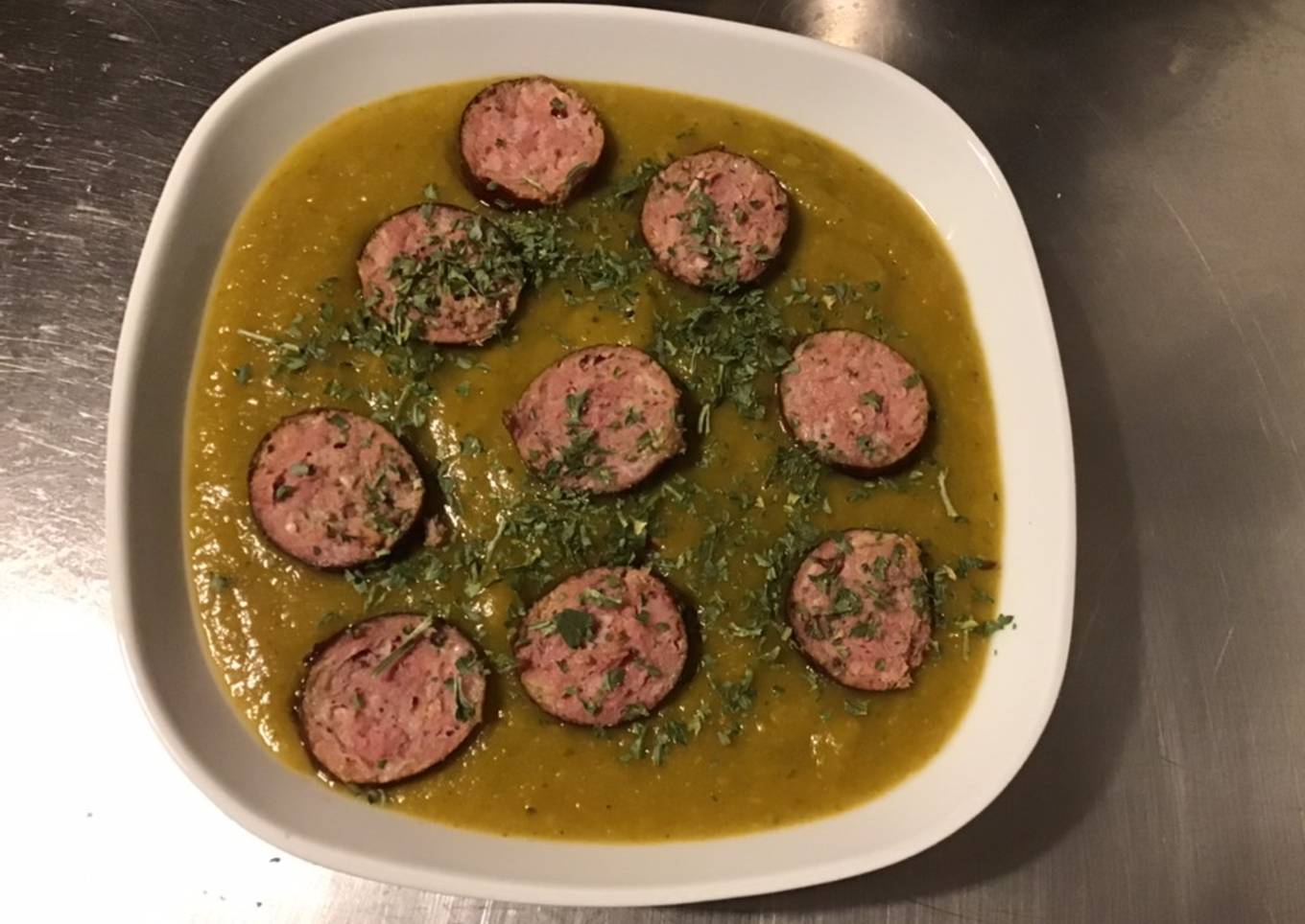 - Ajouter le restant du bouillon et la saucisse fumée baisser à feu doux à la reprise de l ébullition