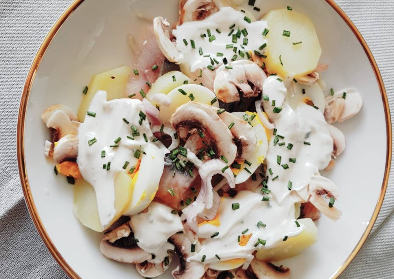 - Épluchez, coupez en rondelles les pommes de terre cuire à l'eau. Faite cuire un oeuf dur (10 min). Coupez les champignons et l'échalote
