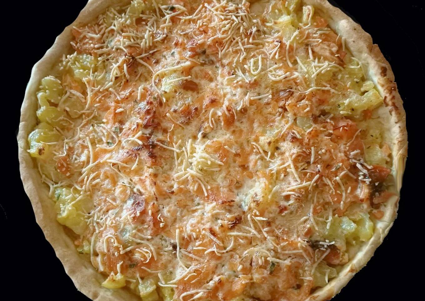 - Déposer uniformément les pommes de terre sur la pâte brisée précuite, puis la préparation avec la truite fumée, l'emmental râpé et enfourner à 180° pour 20 mn. Rectifier la cuisson si nécessaire.