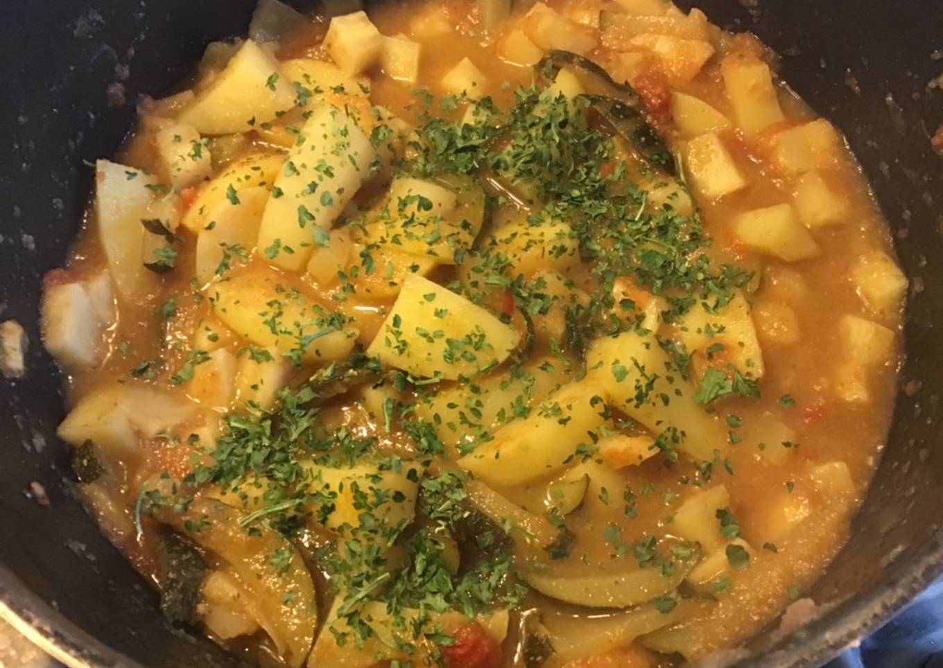 - Éplucher les pommes de terre les couper en 4 les ajouter dans la marmite mélanger poursuivre la cuisson à feu doux
