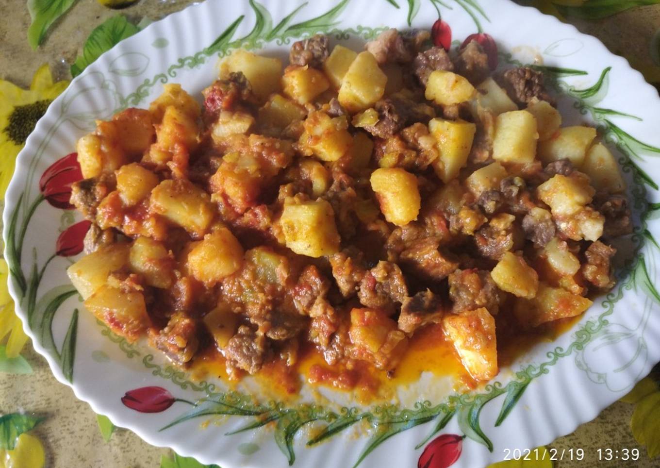 - Faites revenir l'onion, ajoutez la viande, ajustez le sel et les épices, mettez le piment et ajoutez la tomate fraîche et concentrée, laissez mijoter 40 min